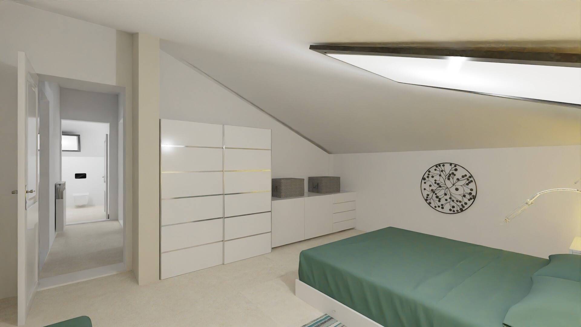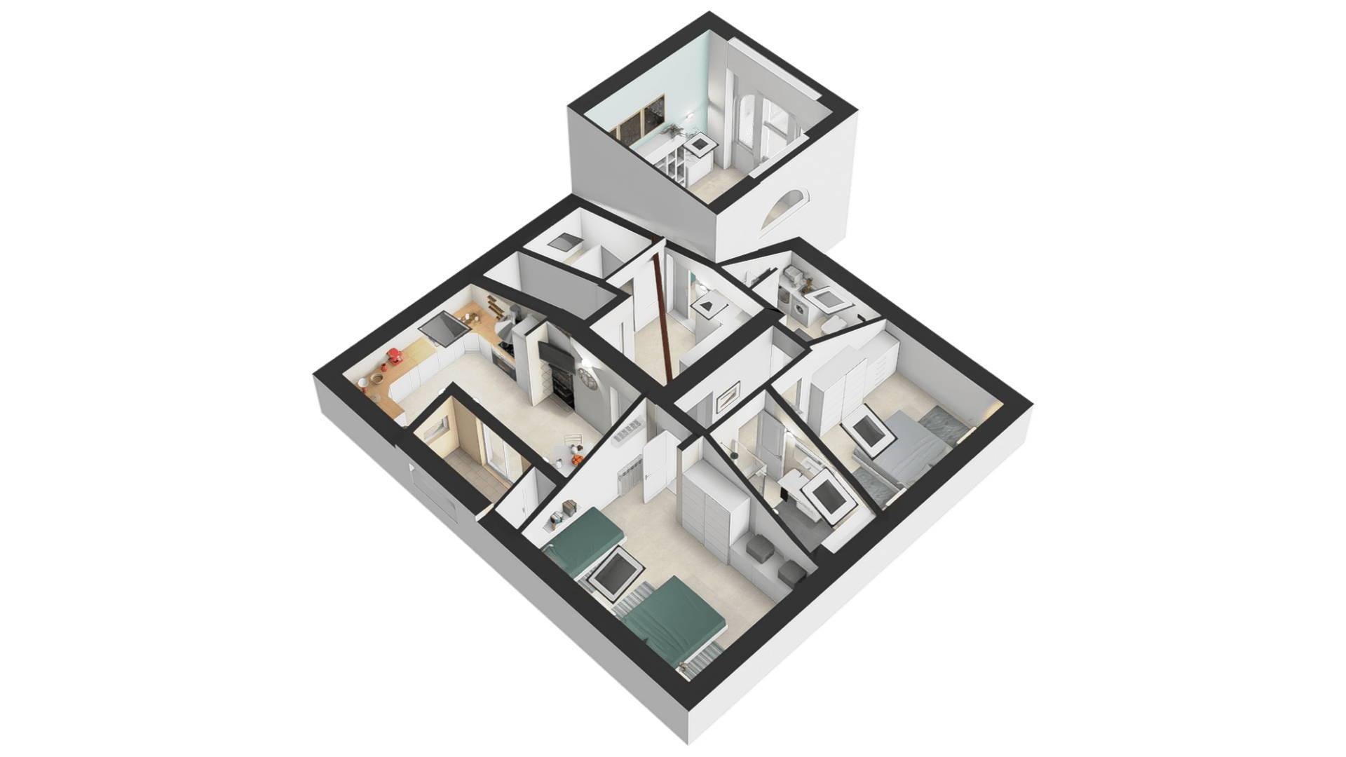 Planimetrie ed assonometrie dell'appartamento nello stato attuale con ipotesi di arredo e virtual staging.