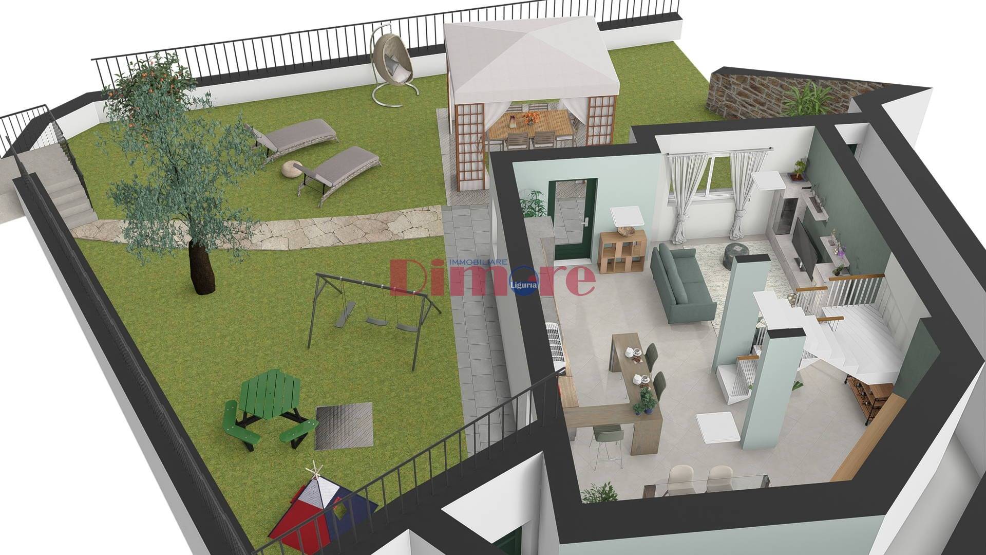 La villa si trova ad Albissola Marina, sulla prima collina a circa 1200 m dal mare, in posizione panoramica e tranquilla, non lontano dal confine con Savona. Il mare e il centro paese si raggiungono in pochi minuti.L’immobile fa parte di un complesso di due villette che seguono il declivio della collina; la villa in vendita è quella posizionata in basso. Si raggiunge l’ingresso dal piano posti auto con una comoda scalinata o con una discesa carrabile utile per eventuale carico e scarico. L’accesso è nel giardino di 450 mq che circonda la casa sul fronte e sul lato di levante ed include anche una fascia di terreno sottostante il livello principale; il giardino è completamente pianeggiante. Dall’ingresso si accede nella zona giorno costituita da un ampio soggiorno con zona cucina-pranzo; volendo è possibile realizzare un secondo bagno. Una comoda scala in muratura conduce alla zona notte al primo piano composta da due spaziose camere; la prima con cabina armadio e finestra con vista mare può ospitare comodamente due letti; la seconda è la matrimoniale, ampia e luminosa grazie alla porta-finestra che si apre sulla terrazza con vista mare panoramica. Lo spazioso bagno con doccia si trova fra le due camere anch'esso con accesso al terrazzo frontale. Dal pianerottolo la scala prosegue al piano mansarda dove si trovano due vani dotati di finestre e velux che possono essere utilizzati a piacimento come stanze da letto o studio; in uno dei vani è possibile realizzare un bagno. Dal corridoio si accede al bel terrazzino a vasca con vista mare. Sul terrazzo si affaccia un vano tecnico che ospita la caldaia a metano utile anche come comodo ripostiglio. La costruzione è nuova con impianti moderni ed efficienti: riscaldamento a pavimento, la caldaia a metano integrata con impianto solare-termico, pompa di calore per condizionamento estivo. Completano la proprietà tre posti auto privati di cui uno coperto.